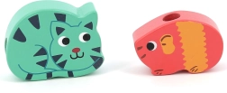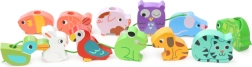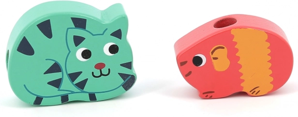 Koraliki przedstawiają różne kształty zwierząt jak żaba, świnka czy ryba, które zachęcają dzieci do zabawy.
