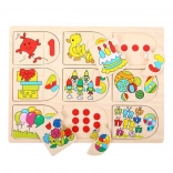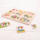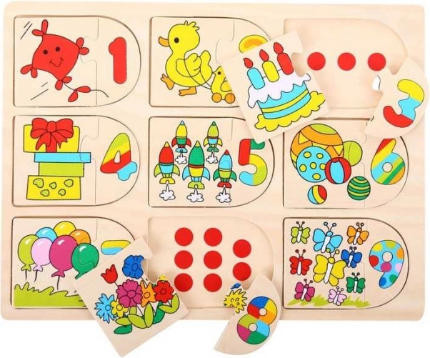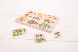 Twoi mali odkrywcy na pewno pokochają tę małą, ciekawą i sprytną układankę. Nie tylko będą się bawić, dopasowując elementy we właściwe miejsca, ale mogą wkładać same obrazki, a do nich dobierać odpowiednie liczby. Każdy element drewnianej układanki ma taki rozmiar, by ułatwić podnoszenie i chwytanie małą dziecięcą rączką. Puzzle są nadrukowane obrazkami lub kolorami, które wspierają proces nauki i dodają wartości edukacyjnej. To świetny sposób na rozwijanie zręczności, rozpoznawania kształtów, koncentracji i liczenia już od najmłodszych lat. Główne cechy: wykonane z wysokiej jakości materiałów z odpowiedzialnych źródeł, zgodne z aktualnymi europejskimi normami bezpieczeństwa.