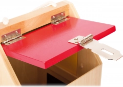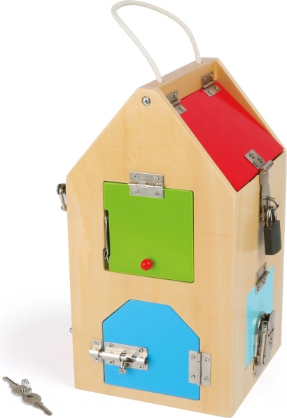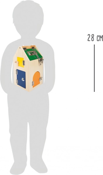 Domek wykonany jest z wysokiej jakości drewna w połączeniu z solidnymi metalowymi częściami, więc wytrzyma nawet intensywne użytkowanie. Dzięki kompaktowym wymiarom i praktycznemu uchwytowi jest łatwy do przenoszenia – idealny w podróży, do przedszkola i do pokoju dziecięcego. Kolorowe elementy zachęcają do odkrywania i wspierają rozpoznawanie barw.