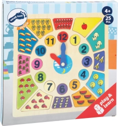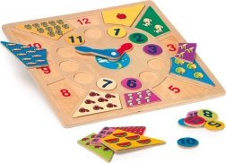 Drewniana układanka „Naucz się zegara” to pomysłowa pomoc edukacyjna, dzięki której dzieci łatwo opanują odczytywanie czasu i rozpoznawanie ilości. Wyjmowane elementy z liczbami wkłada się z powrotem na właściwe miejsca, co wspiera koncentrację i koordynację ręka–oko.