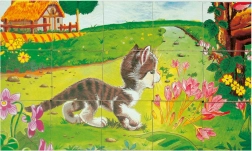Dzieci ułożą obrazki gęsi przy potoku, szczeniąt na łące czy prosiąt przy chlewie – żywe kolory i miłe ilustracje wspierają wyobraźnię i poznawanie zwierząt.