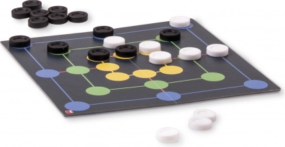 - 2 gry w 1: obrotowa, dwustronna plansza do warcabów i młyna