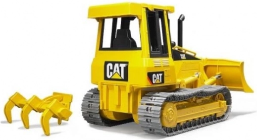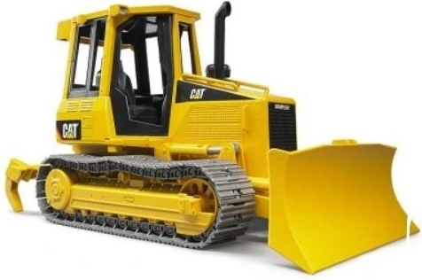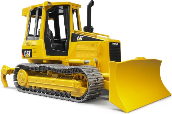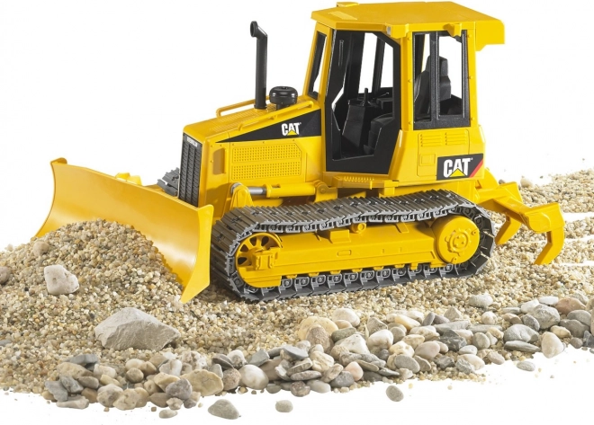 Model z detalami charakterystycznymi dla maszyn marki CAT, w tym gumowe gąsienice i duży ruchomy lemiesz.