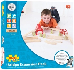 Rozszerz swoją drewnianą kolejkę o uniwersalny zestaw mostowy z 18 elementami, który doda zabawie nowe wysokości i przygody. Zestaw zawiera tory wznoszące i opadające, podpory oraz elementy mostów, aby łatwo pokonywać przeszkody. Jest w pełni kompatybilny z większością drewnianych kolejek i wykonany z wysokiej jakości drewna. Kompatybilność, wysokiej jakości materiały, bezpieczna zabawa oraz rozwój wyobraźni i małej motoryki.