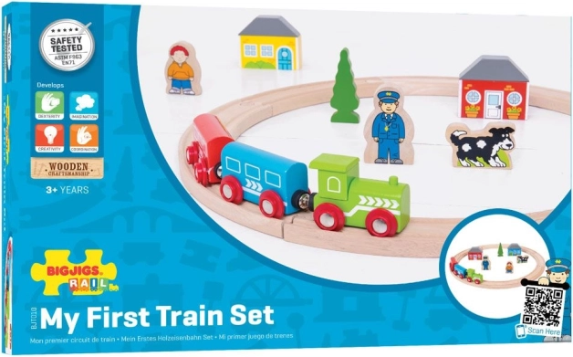 - 8× drewniane tory, 1× lokomotywa, 2× wagonik z magnetycznymi złączkami, 8× dodatki (domy, drzewa, figurki)
