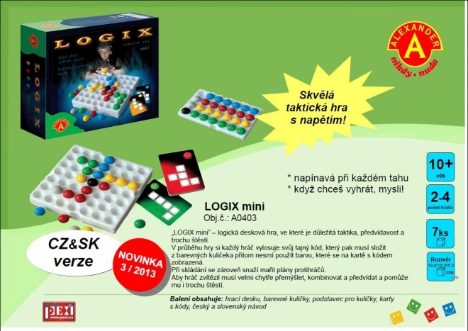 Logiczna gra dla 2–4 graczy od 10 lat. Każdy gracz układa z kolorowych kulek „tajny kod”. Karty określają kształt i liczbę kulek tajnego kodu. Buduj swój kod i burz przy tym kod przeciwnika. Jeśli chcesz wygrać, myśl – pierwszy kompletny kod wygrywa! Na początku gry każdy gracz losuje kartę z tajnym kodem rozmieszczenia kulek. W trakcie rozgrywki gracze starają się dokładaniem lub przesuwaniem kulek ułożyć swój kod. Celem gry jest jak najszybsze przesuwanie i dodawanie kulek na planszy zgodnie z wzorem (kodem) na wylosowanej karcie. Wykorzystaj kulki przeciwnika i zniszcz jego kod, zanim go w pełni ukończy. Kolor pokazany na karcie wyznacza kolor zakazany, którego nie wolno użyć. Dołóż ostatnią kulkę do swojego wzoru, krzyknij: „Mistrz Logix!” i wygrywasz. Opakowanie zawiera: planszę do gry, kolorowe kulki (zielone, niebieskie, żółte, czerwone, szare, czarne), zasobnik na kulki, karty z tajnymi kodami, polską i słowacką instrukcję. Główne cechy: rozwija logiczne myślenie dzieci, odpowiednia dla dzieci od 10 lat. Dokumentacja: instrukcja gry PL, instrukcja gry SK