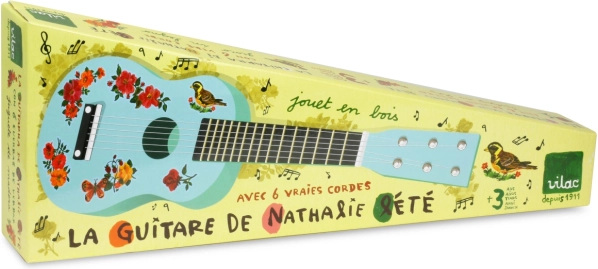 Odkryj magię muzyki z akustyczną gitarą Nathalie Lété. Ta piękna drewniana gitara z kolorowymi ilustracjami jest idealna dla małych miłośników muzyki: