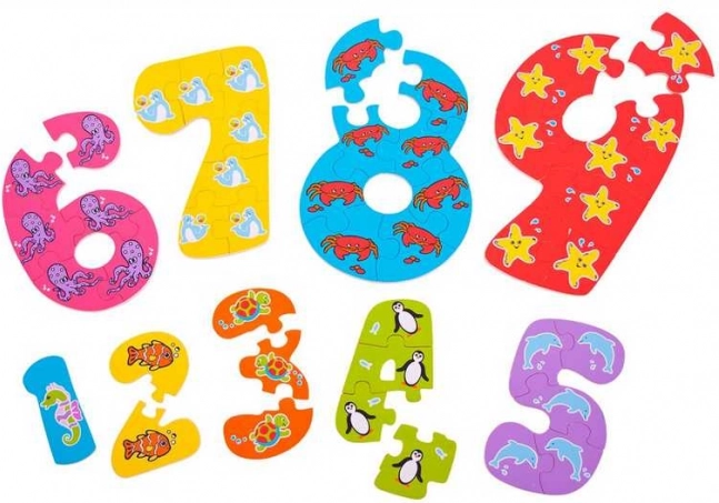 - Liczby 1–9 w formie układanek – każda liczba to mini układanka z 1 do 9 elementów.