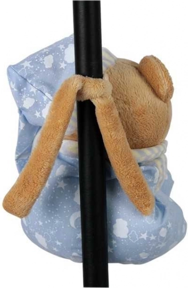 Miś ma niebieską piżamkę z wzorem gwiazdek i księżyca, który działa kojąco i jest idealnym towarzyszem do dziecięcego pokoju.