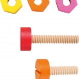 Kolorowe drewniane śruby i nakrętki służą do ćwiczenia małej motoryki i treningu koordynacji ręka-oko.