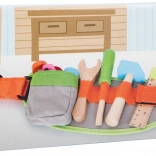 Regulowany pas na narzędzia dla dzieci marki Small Foot jest wyposażony w różnorodne narzędzia do zabawnej i pouczającej zabawy. Dzięki zmiennej długości pasa (41–103 cm) każdy mały majsterkowicz łatwo dopasuje go do siebie. Zestaw zawiera: młotek, śrubokręt, klucz, kątomierz, śruby i nakrętki.