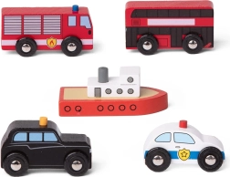 - 5 elementów w opakowaniu: wóz strażacki, radiowóz, piętrowy autobus, taksówka, łódź.