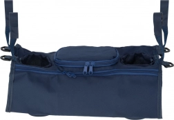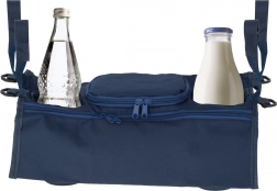 Praktyczny organizer do wózka z dwoma uchwytami na butelki, pojemną kieszenią na zamek oraz mniejszą kieszonką na zamek. Łatwo montowany za pomocą rzepów, utrzymuje wszystkie niezbędne rzeczy pod ręką – od pieluch i chusteczek po zabawki, telefon oraz butelkę z mlekiem lub napojem.