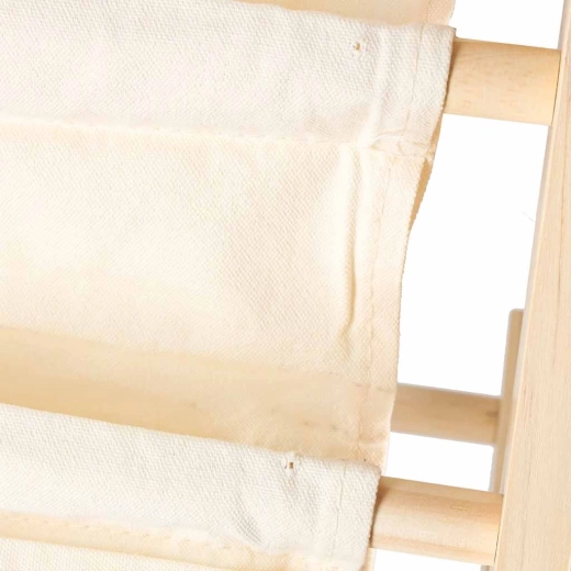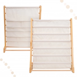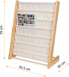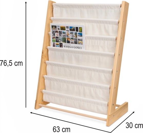 Elegancki i praktyczny drewniany regał na książki łatwo stanie się częścią każdego pokoju dziecięcego. Oferuje aż 6 tekstylnych półek, które zapewnią wystarczającą przestrzeń na książki, kolorowanki i inne potrzeby twoich dzieci. Wysokość regału wynosi 76,5 cm, co umożliwia dziecku łatwe sięganie po wszystkie półki.