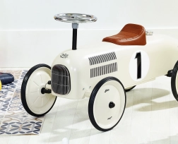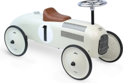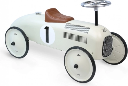 Stylowy dziecięcy jeździk w wyglądzie samochodu wyścigowego zachwyca retro urokiem i solidnym metalowym wykonaniem. Oferuje cichą jazdę dzięki ogumowanym kołom, łatwe sterowanie kierownicą oraz mocną konstrukcję o nośności 20 kg – idealny dla małych rajdowców od 1,5 roku.