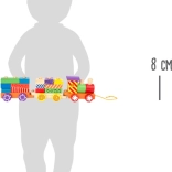 Zabawny pociąg do ciągnięcia dla najmłodszych rozwija motorykę, koordynację i wyobraźnię. Dzięki kolorowym drewnianym klockom można łatwo zmieniać wygląd lokomotywy i dwóch wagoników, które można połączyć i ciągnąć za sznurek. Wesołe kolory i wzory zachęcają do zabawy i nauki.