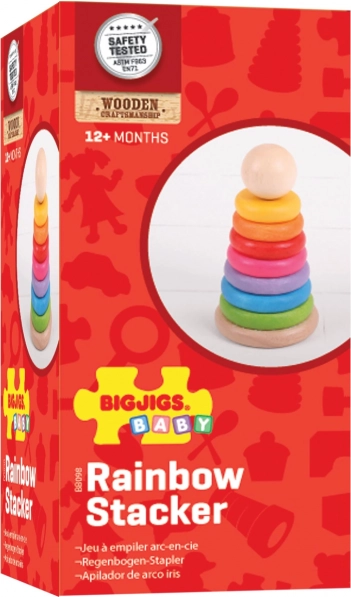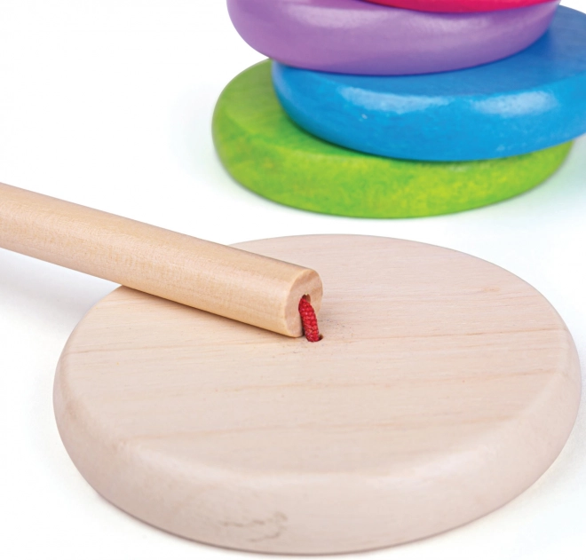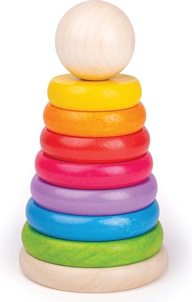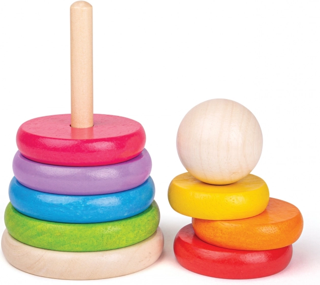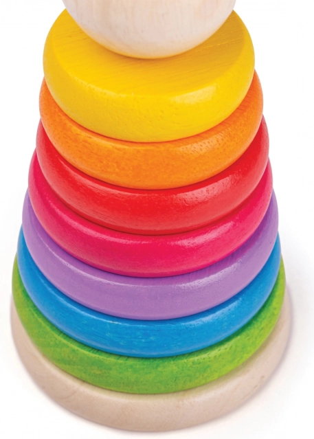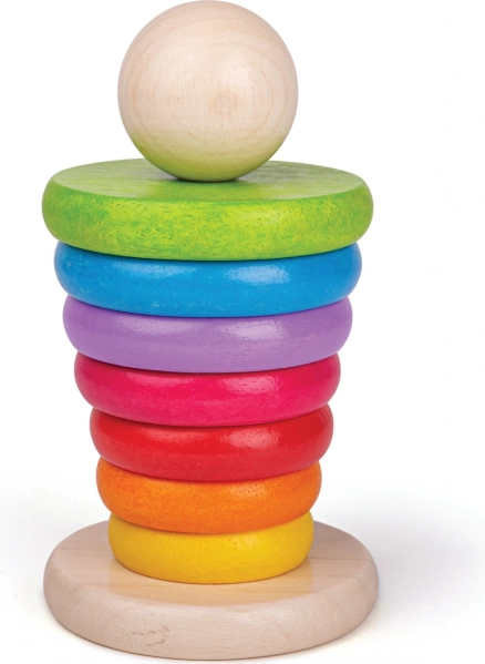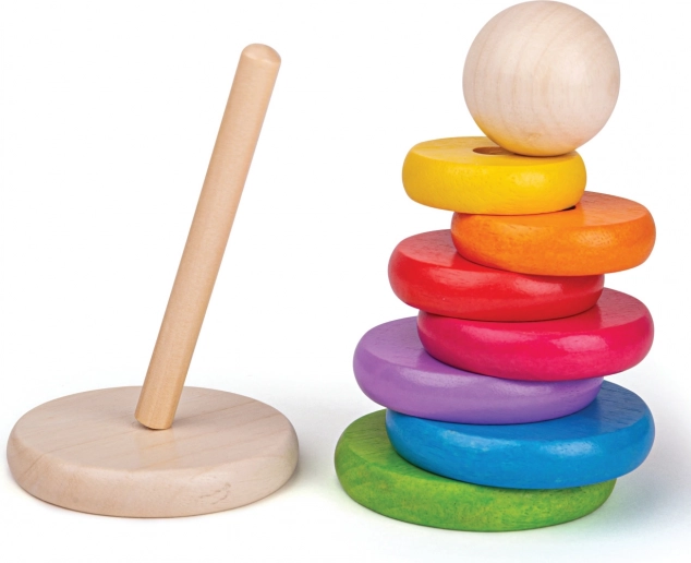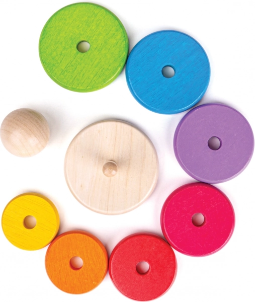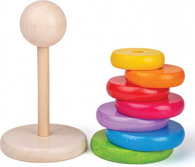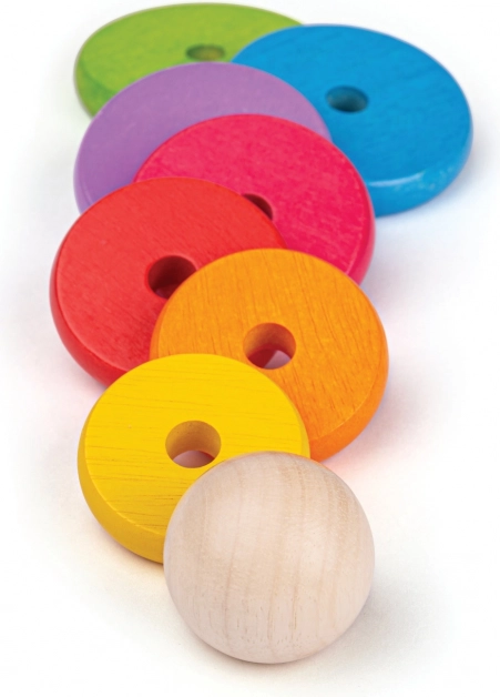 Zabawka zawiera 9 krążków w tęczowych barwach, które urozmaicą każdą zabawę i pomogą w rozróżnianiu kolorów.