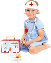 Dzieci pokochają drewniany lekarski kuferek, który wspiera ich kreatywność i umiejętności społeczne. Ten zestaw oferuje świetną okazję do zabawy w lekarza, co pomaga rozwijać zdolności językowe i społeczne dziecka.