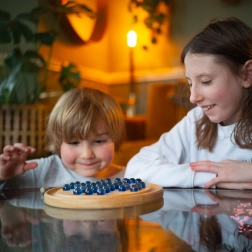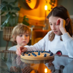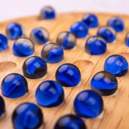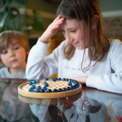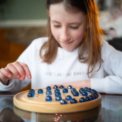 Okrągła plansza z gładkiego drewna i błyszczące szklane kulki zapewniają przyjemne wrażenia podczas gry i długą żywotność.