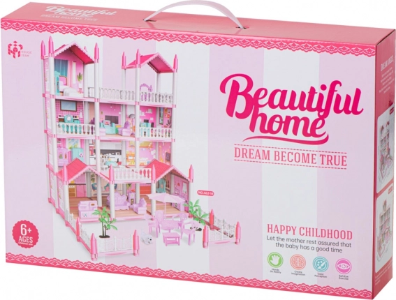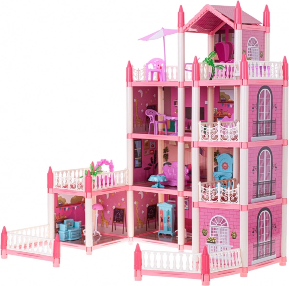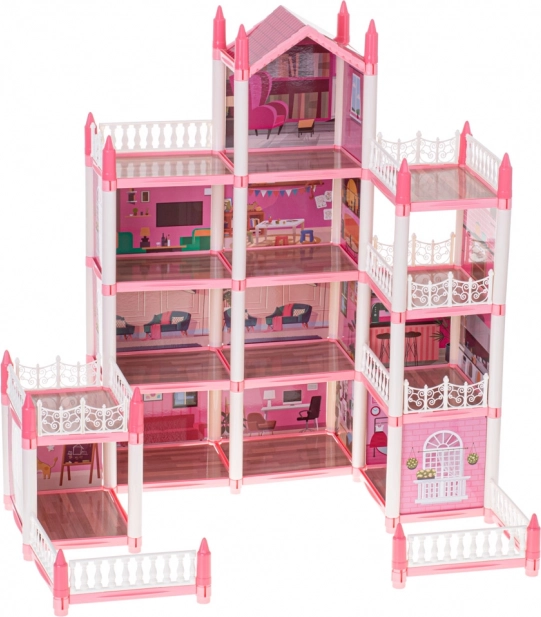 Różowa willa dla lalek ma cztery piętra, które oferują fascynujące i zróżnicowane pomieszczenia do odkrywania.