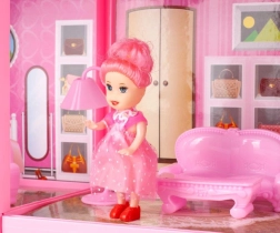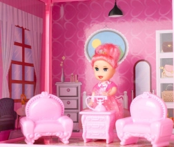 W zestawie znajduje się pełne wyposażenie: łóżko, sofy, foteliki, toaletka, szafa, komoda, lampka i inne. Dzieci mogą dowolnie przestawiać wnętrze.