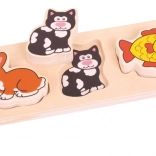 Drewniane puzzle–wkładanka BIGJIGS z motywami psa, kota, królika, rybki i świnki morskiej to idealna pierwsza układanka dla najmłodszych. Elementy mają przyjemny kształt i rozmiar dla małych rączek, dzięki czemu łatwo je podnosić i wkładać w odpowiednie otwory. Kolorowa, nadrukowana płyta bazowa naprowadza dziecko na właściwe dopasowanie i wzmacnia radość z nauki.