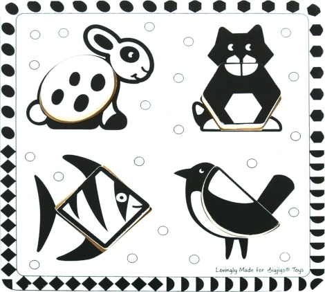 Czarno-biała układanka wpuszczana BIGJIGS TOYS została zaprojektowana specjalnie dla niemowląt i maluchów, które najlepiej reagują na wysoki kontrast. Cztery solidne drewniane kształty wkłada się w tablicę z ilustrowanymi motywami zwierząt, co motywuje dzieci do wielokrotnych prób i naturalnie wzmacnia koordynację ręka–oko.