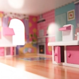 Ten przestronny drewniany domek dla lalek ucieszy dzieci i rodziców. Trzy piętra o minimalnej wysokości kondygnacji 18 cm kryją kuchnię, łazienkę, sypialnię, salon oraz schody z balkonami. W zestawie stylowe meble z drewna i plastiku oraz samoprzylepna taśma LED o chłodno białym świetle – idealna także jako delikatna lampka nocna.
