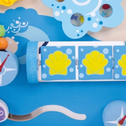 Obrotowy labirynt, wirujące koniki morskie, przesuwane rybki oraz koralikowy drucik z mewami utrzymują uwagę dzieci i rozwijają małą motorykę oraz koordynację.