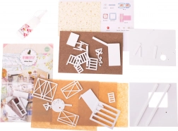 W opakowaniu znajdziesz wszystko, co potrzebne: elementy konstrukcyjne pokoju, części wyposażenia i dekoracje, klej oraz szczegółową instrukcję z ilustracjami. Oświetlenie jest zasilane 2× AAA 1,5 V i 3× LR54 1,5 V (baterie nie są dołączone). Zalecane od 8 lat. Gotowy model ma wymiary 17,1 × 13 × 11,6 cm; opakowanie 25 × 18 × 6 cm.