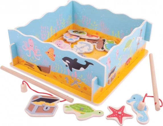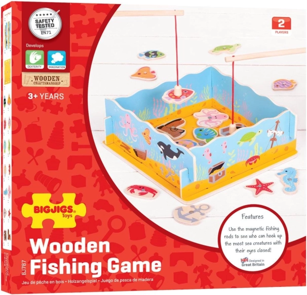 Dzieci za pomocą magnetycznych wędek łowią 11 rybek oraz inne elementy, takie jak skrzynia skarbów, but czy kotwica, trenując precyzję podczas odkładania ich w odpowiednie miejsca. Wysokiej jakości drewniane wykonanie i bezpieczne farby gwarantują długą trwałość i bezpieczną zabawę.