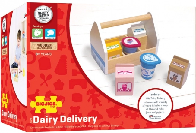 Ta solidna drewniana skrzynka kryje cztery kartony napojów (mleko, sok pomarańczowy, koktajl truskawkowy i czekoladowy) oraz kubeczek jogurtu i śmietanki. Idealny dodatek do dziecięcej kuchni i sklepiku, który w przystępny, zabawowy sposób przybliża dzieciom podstawy zdrowego żywienia i pochodzenie żywności.