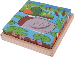 Klocki obrazkowe z motywami farmy ucieszą małych budowniczych i miłośników zwierząt. Z szesnastu solidnych drewnianych klocków dzieci stopniowo ułożą sześć różnych scen – wystarczy odpowiednio obracać poszczególne klocki i odnajdywać elementy, które do siebie pasują. Zabawa w atrakcyjny sposób wspiera koordynację oko–ręka, logiczne myślenie oraz cierpliwość.
