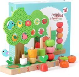 Odkryj zabawną drewnianą zestaw Vilac, który pomaga dzieciom nauczyć się liczyć, rozpoznawać kolory i kształty, a jednocześnie ćwiczyć motorykę małą. Kolorowe elementy warzyw i owoców nakłada się na ponumerowane kołki, a po drzewku przesuwają się koraliki – bezpieczna i wytrzymała konstrukcja jest idealna dla dzieci od 18 miesięcy.