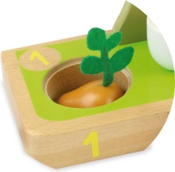 Ponumerowana drewniana podstawa 1–5 uczy dzieci liczyć i porównywać ilości. Układanie warzyw i kształtów wspiera logiczne myślenie i koordynację.