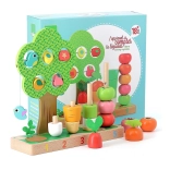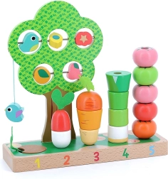 Ta wysokiej jakości drewniana zabawka łączy naukę i zabawę w jednym. Dzieci nakładają i nawlekają marchewkę, por, pomidorki oraz inne kształty na ponumerowane kołki 1–5, dzięki czemu w naturalny sposób przyswajają liczenie oraz sortowanie według kolorów i rozmiarów. W zestawie znajduje się także drzewko z ruchomymi elementami do odkrywania i treningu koordynacji ręka–oko.
