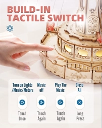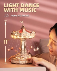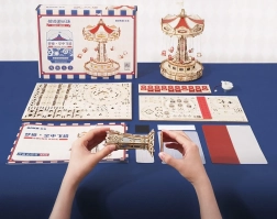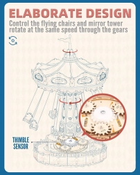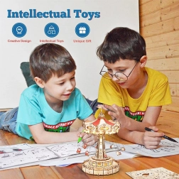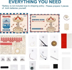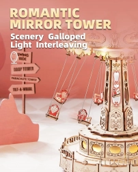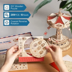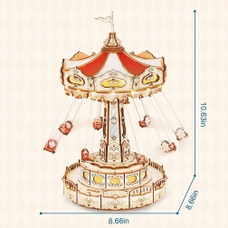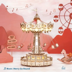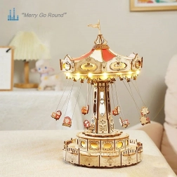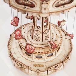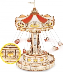 Ta 3D układanka–pozytywka przedstawia elegancką karuzelę łańcuchową z bogatymi zdobieniami w naturalnych i kolorowych tonach. Po złożeniu karuzela rusza dzięki silnikowi, rozświetla się oświetleniem LED i odtwarza melodię Merry Go Round, wyczarowując nostalgiczną, romantyczną atmosferę. Zestaw dostarczany jest w stanie niezłożonym z szczegółową instrukcją – idealny projekt na kreatywny weekend.