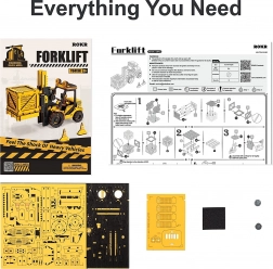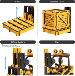Model wózka widłowego ożywa dzięki funkcjonalnym elementom – obracające się koła i mechanizm podnoszenia dodają konstrukcji realizmu i frajdy.