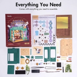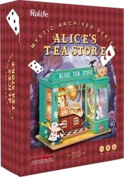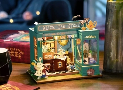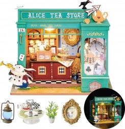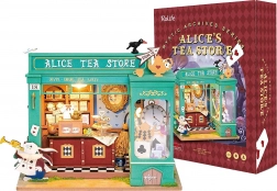 Odkryj miniaturowy świat pełen fantazji – utrzymany w zieleni sklep z herbatą z motywami białego królika, kieszonkowego zegarka i szachownicowej podłogi tworzy atmosferę europejskiego popołudniowego podwieczorku. Po włączeniu oświetlenia LED model zamienia się w czarującą dekorację z przyjemnym wieczornym nastrojem.