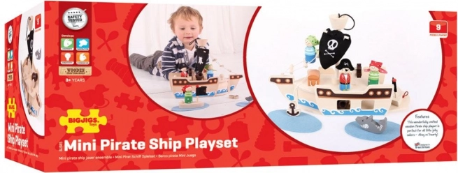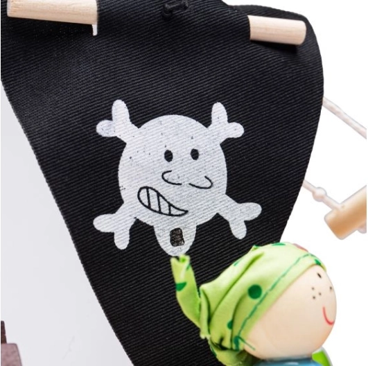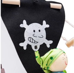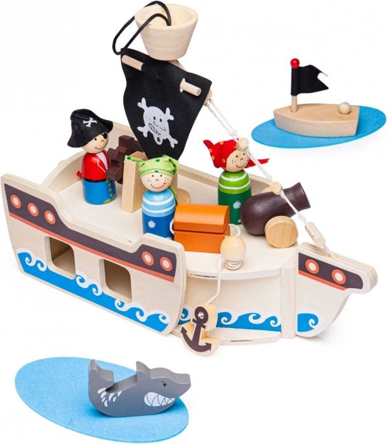 Ten drewniany zestaw statku pirackiego zawiera wszystko, czego małe piraty potrzebują do swoich przygód. Pakiet zawiera kapitana, dwóch piratów, statek, kotwicę, skrzynię ze skarbami i rekina. Wszystkie elementy gry można wygodnie umieścić w statku, co jest idealne do podróżowania i łatwego przenoszenia.