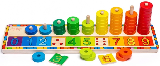 Rząd liczb 0–9 i krążki do nakładania prowadzą dzieci do naturalnego zrozumienia ilości, kolejności i podstaw liczenia.