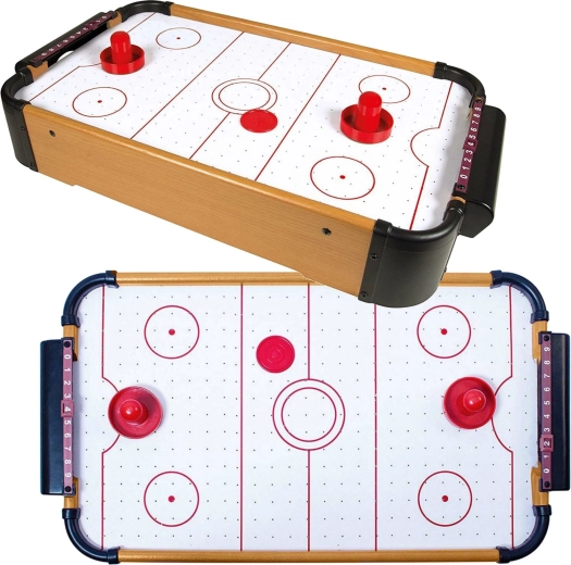 Stół ma solidną drewnianą ramę, zintegrowane bramki, manualne suwakowe liczniki punktów po obu stronach i jest dostarczany z dwoma popychaczami i krążkiem. Gra rozwija koncentrację, koordynację ręka–oko oraz fair play.