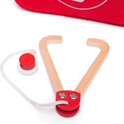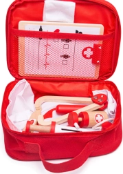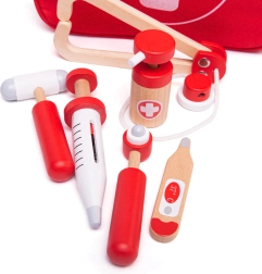 Przenośny lekarski kuferek dla małych lekarzy zawiera 10 starannie wykonanych narzędzi z drewna i tkaniny. Wspiera kreatywną i pomysłową zabawę, uczy troski i empatii, a dzięki praktycznej torbie na zamek jest idealny również w podróży. Wykonany z wysokiej jakości i bezpiecznych materiałów, odpowiedni od 3 lat.