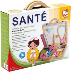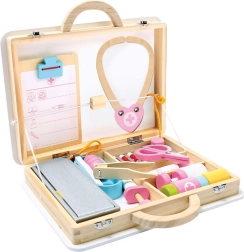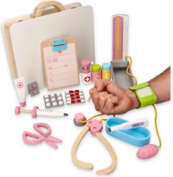 W zestawie znajdują się drewniane narzędzia takie jak stetoskop, strzykawka i inne akcesoria wspierające realistyczną zabawę.