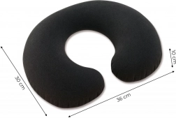 Konstrukcja z wytrzymałego PVC w połączeniu z miękkim welurem na powierzchni zapewnia przyjemny kontakt ze skórą oraz większą odporność na ścieranie. Po nadmuchaniu poduszka ma wymiary 36 × 30 × 10 cm, po spuszczeniu powietrza łatwo zmieści się w torebce lub bagażu podręcznym.