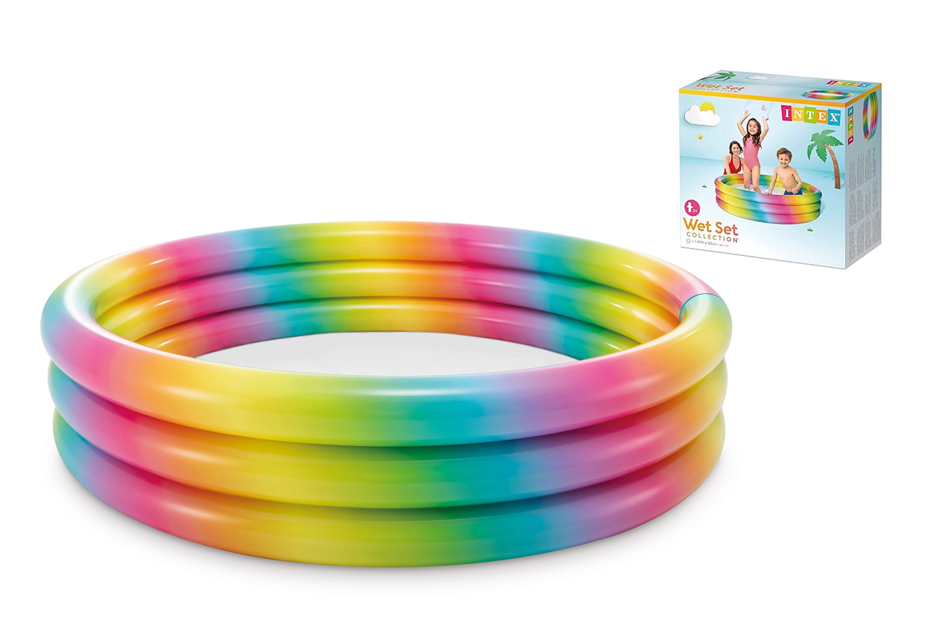 Ten kolorowy basen zachwyca atrakcyjną tęczową paletą barw, która urzeknie dzieci i doda każdemu ogrodowi wesołej atmosfery.