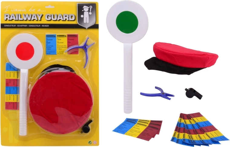 Wszystkie elementy, oprócz czapki, wykonane są z wysokiej jakości plastiku. Ten zestaw jest idealny dla dzieci od 3 lat, które lubią pociągi i bawią się w konduktora.