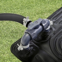 Dzięki możliwości łączenia wielu mat dopasujesz moc ogrzewania do objętości basenu. Zintegrowany zawór bypass pozwala regulować przepływ lub tymczasowo wyłączyć matę z obiegu. Mata obsługuje węże Ø 32 mm, a przy użyciu dołączonych adapterów także Ø 38 mm. Dla najlepszej wydajności użyj pompy filtrującej o przepływie 2006–5678 l/h.