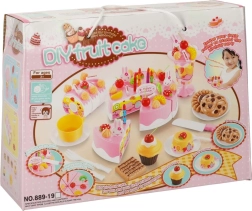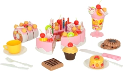 Oprócz tortu nie brakuje ciasteczek, roladek, babeczki, pucharka na lody i akcesoriów – wszystko do realistycznej zabawy w przyjęcie.