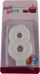 Elegancka urodzinowa świeczka w kształcie cyfry 9 z delikatnym brokatem to doskonały wybór na wyjątkowy moment zdmuchnięcia życzenia. Dzięki czystemu, białemu wykończeniu i brokatowi świetnie pasuje do różnych stylów tortów i dekoracji.